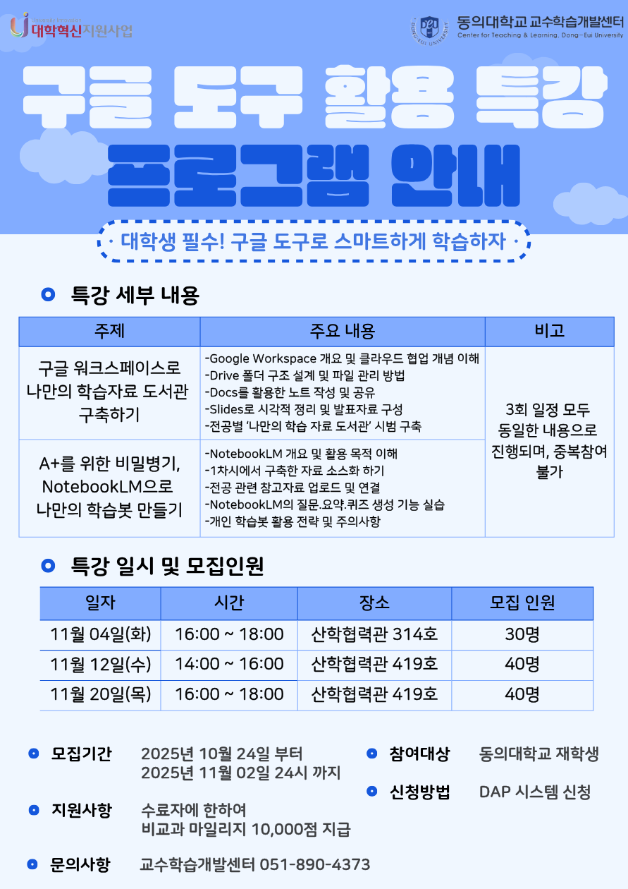 교수학습개발센터에서는 학습과 과제 수행에 실질적으로 도움이 되는 구글 도구 활용 능력을 지원하고자 「구글 도구 활용 특강」을 운영하고자 합니다. 각 단과대학에서는 재학생들이 해당 특강에 참여할 수 있도록 안내 및 신청 협조를 요청드립니다.